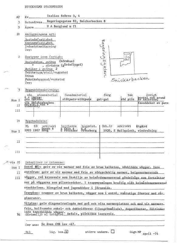 Under åren 1973-1983 inventerade Stockholms stadsmuseum hus i innerstaden som var byggda före 1960. Gamla Stan, Mariaberget, Åsöberget och delar av Katarinaberget är inte med i innerstadsinventeringen. I inventeringen finns uppgifter om byggnadsår, arkitekt, byggherre, byggmästare, ombyggnader m.m. I korthet beskrivs fastighetens fasader och trapphus som de såg ut vid inventeringstillfället. Enstaka lägenheter beskrivs kort. Längst ner till höger på blanketten ser du när inventeringen genomfördes. Några förkortningar som används är: BL = bygglov, SB= slutbesiktning.