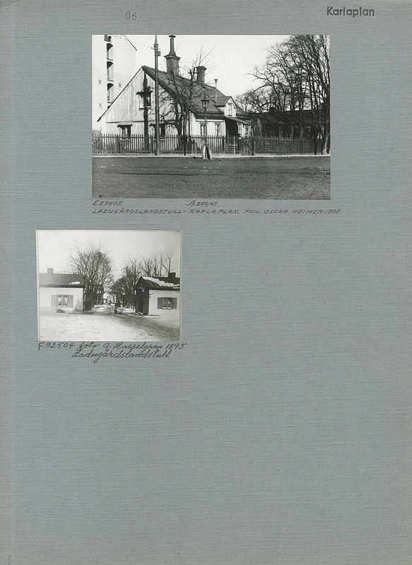 Det här gråarket ligger i en mapp med följande information: Karlaplan. - Djursborg, Ladugårdslandstull. Stadsmuseet påbörjade arbetet med Gråarkssamlingen på 1930-talet. Syftet var att skapa en sammanställning av bildmaterial över Stockholm och ordna det geografiskt eller ämnesvis på stora gråa pappersark. Samlingen har växt under drygt 60 år. Läs mer under Hjälp/Innehåll som du hittar högst upp på Digitala stadsmuseet.