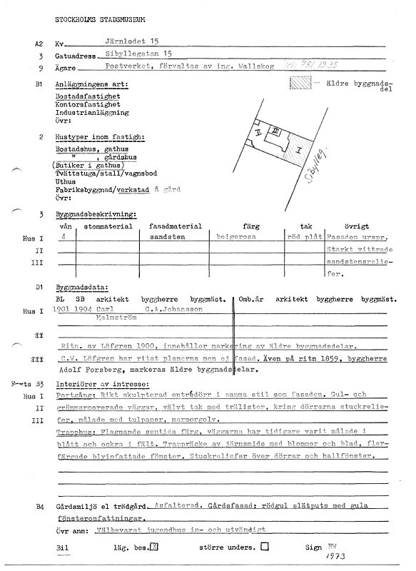 Under åren 1973-1983 inventerade Stockholms stadsmuseum hus i innerstaden som var byggda före 1960. Gamla Stan, Mariaberget, Åsöberget och delar av Katarinaberget är inte med i innerstadsinventeringen. I inventeringen finns uppgifter om byggnadsår, arkitekt, byggherre, byggmästare, ombyggnader m.m. I korthet beskrivs fastighetens fasader och trapphus som de såg ut vid inventeringstillfället. Enstaka lägenheter beskrivs kort. Längst ner till höger på blanketten ser du när inventeringen genomfördes. Några förkortningar som används är: BL = bygglov, SB= slutbesiktning.