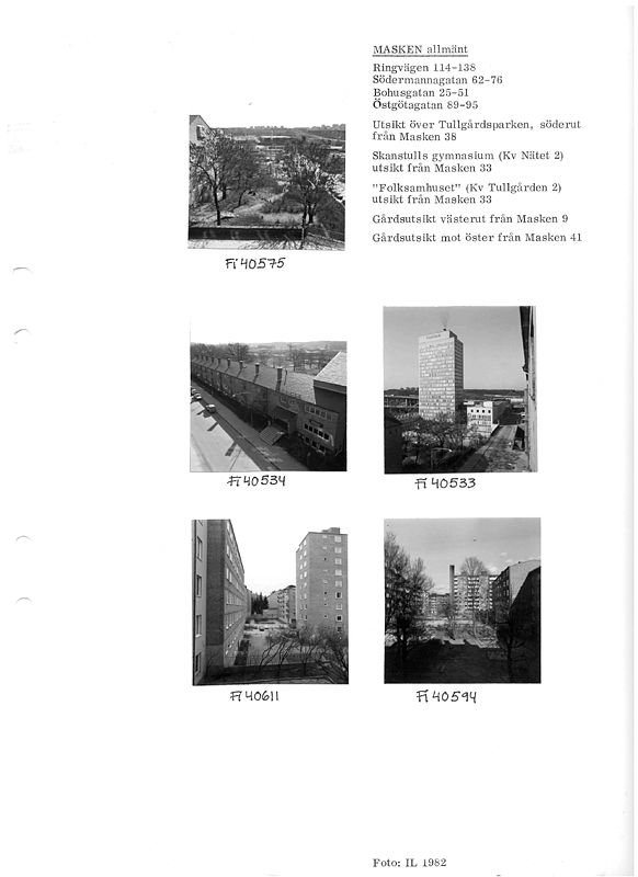 Under åren 1973-1983 inventerade Stockholms stadsmuseum hus i innerstaden som var byggda före 1960. Gamla Stan, Mariaberget, Åsöberget och delar av Katarinaberget är inte med i innerstadsinventeringen. I inventeringen finns uppgifter om byggnadsår, arkitekt, byggherre, byggmästare, ombyggnader m.m. I korthet beskrivs fastighetens fasader och trapphus som de såg ut vid inventeringstillfället. Enstaka lägenheter beskrivs kort. Längst ner till höger på blanketten ser du när inventeringen genomfördes. Några förkortningar som används är: BL = bygglov, SB= slutbesiktning.