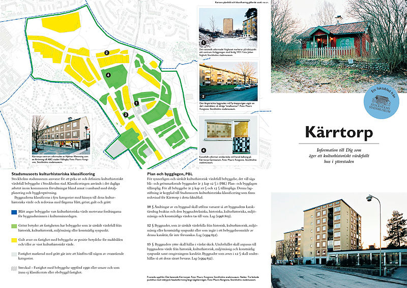 PUBLIKATION Kärrtorp : information till Dig som äger ett kulturhistoriskt värdefullt hus i ytterstaden. - Stockholm : Stockholms stadsmuseum. Kulturmiljöenheten, 2009. - 6 s. : ill. - (Ett faktablad från Stockholms stadsmuseum)