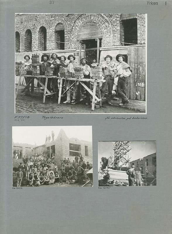 Det här gråarket ligger i en mapp med följande information: Yrken A till E. - Bokbindare, borstbindare, kvastbindare, byggnadsarbetare (timmermän, mursmäcka, rivning, muddring, pålning, grävning, tegelbärare), dykare. Stadsmuseet påbörjade arbetet med Gråarkssamlingen på 1930-talet. Syftet var att skapa en sammanställning av bildmaterial över Stockholm och ordna det geografiskt eller ämnesvis på stora gråa pappersark. Samlingen har växt under drygt 60 år. Läs mer under Hjälp/Innehåll som du hittar högst upp på Digitala stadsmuseet.