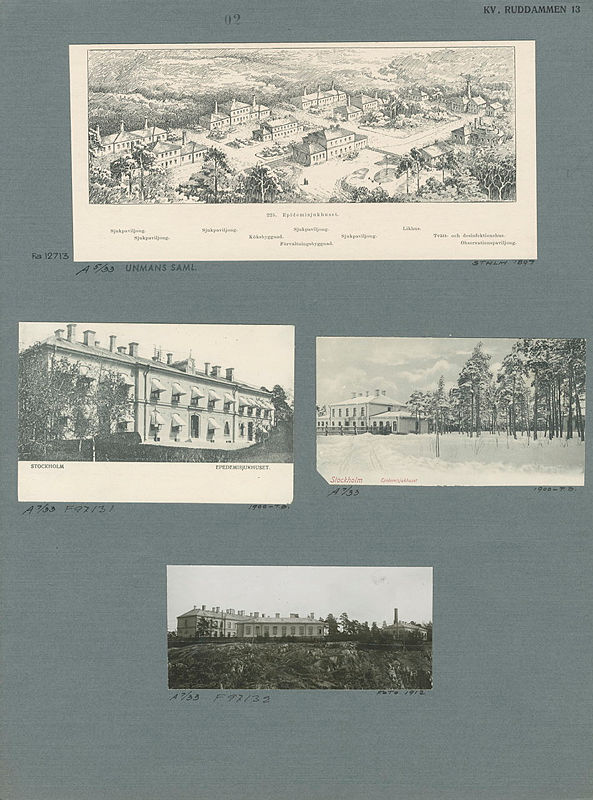 Det här gråarket ligger i en mapp med följande information: Kvarteret Ruddammen. - Norra Djurgården, Kvarteret Körsbärsbladet. Stadsmuseet påbörjade arbetet med Gråarkssamlingen på 1930-talet. Syftet var att skapa en sammanställning av bildmaterial över Stockholm och ordna det geografiskt eller ämnesvis på stora gråa pappersark. Samlingen har växt under drygt 60 år. Läs mer under Hjälp/Innehåll som du hittar högst upp på Digitala stadsmuseet.